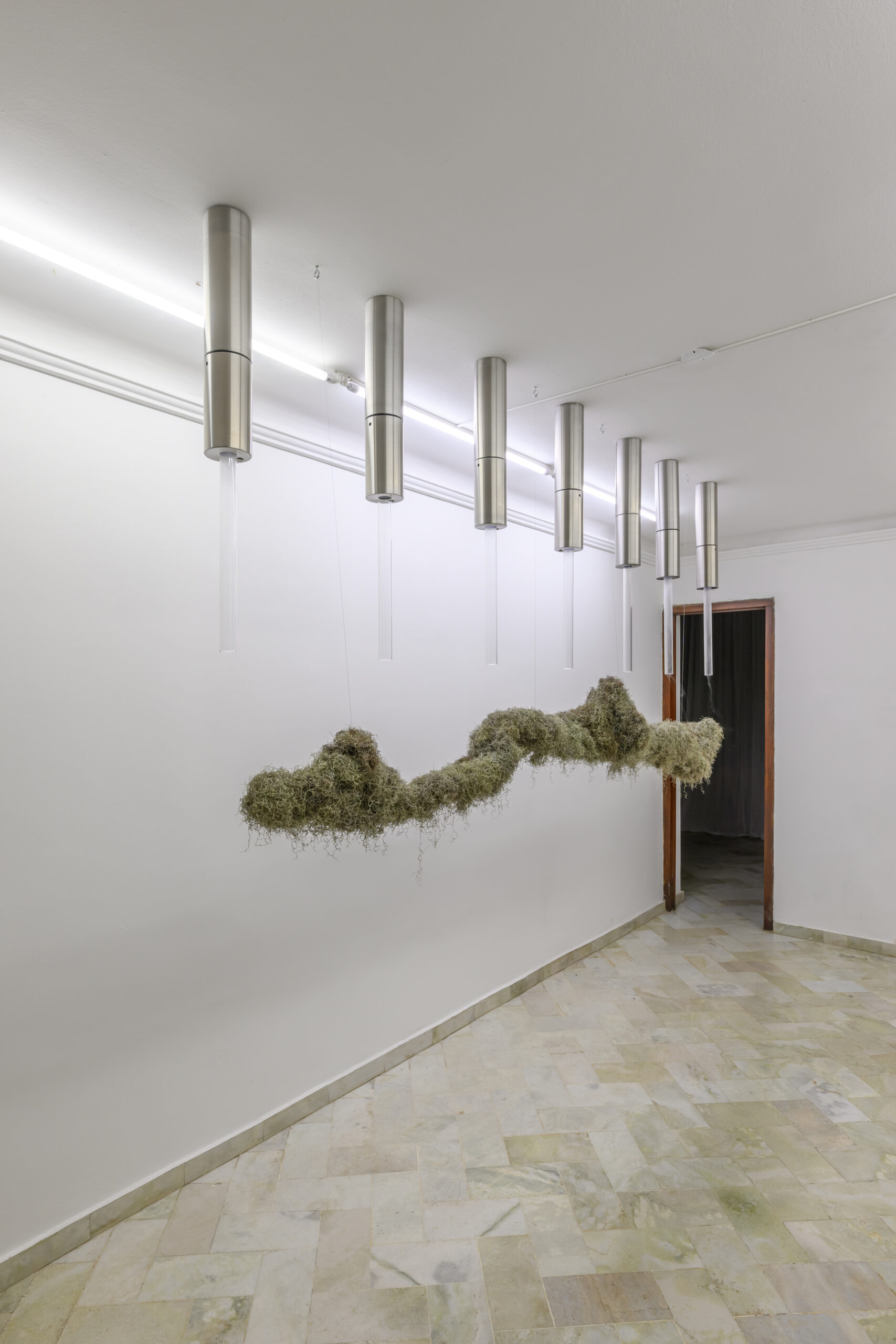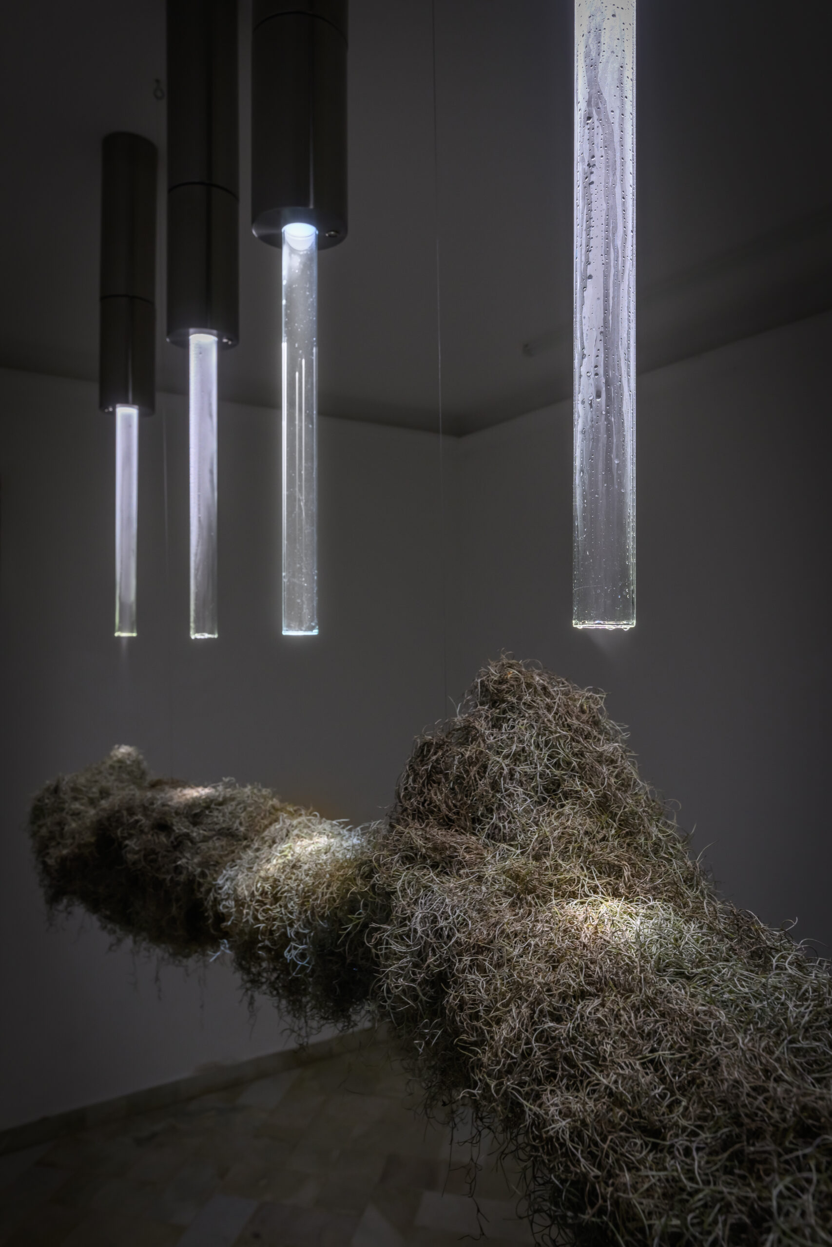 Casualmente, la planta epífita Tillandsia usneoides depende de la humedad del entorno para sobrevivir; en este caso, se alimenta de la niebla que emite la obra de Amparo y Rocío.