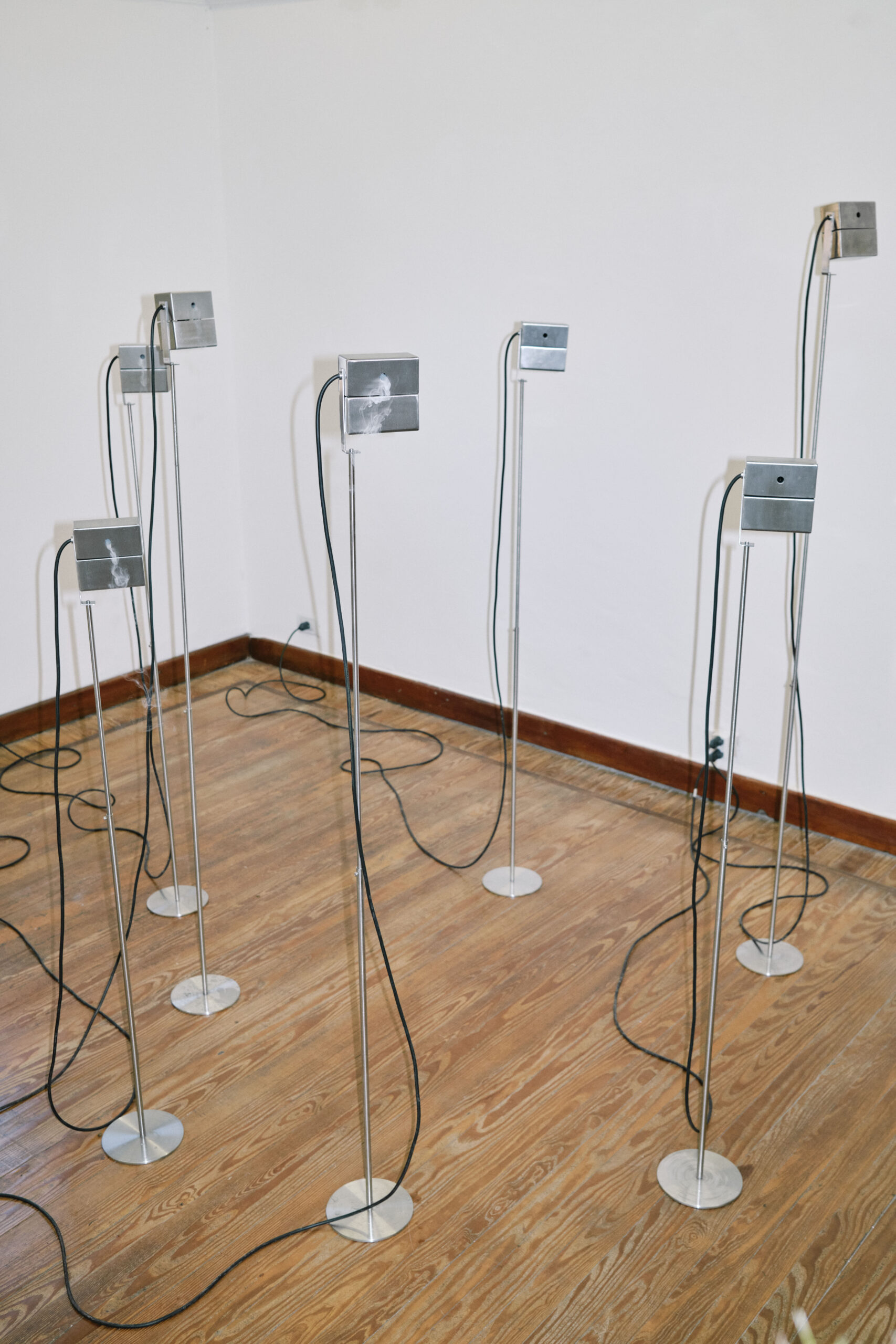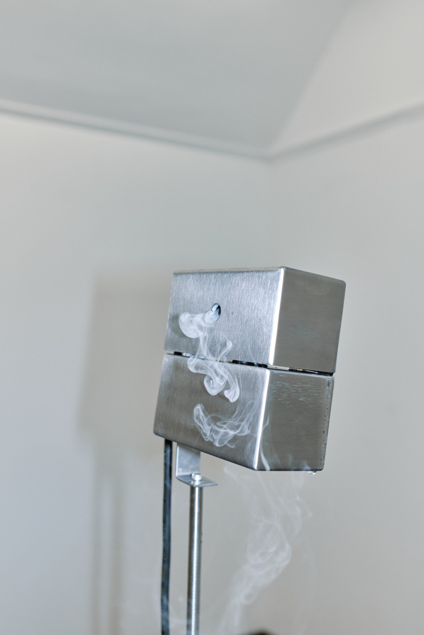 Siete contenedores metálicos cuelgan del techo. Resguardan una sustancia que, a partir de un sistema electrónico, se transforma en niebla y se desliza por tubos de vidrio hasta ser captada por el olfato. La luz subraya el recorrido huidizo del vapor, de su materia fugaz.
