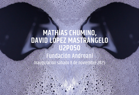 El sábado 8 de noviembre, desde las 15 h, se inaugura una nueva temporada de exhibiciones en Fundación Andreani. Se trata de tres exposiciones individuales de Mathías Chumino y Federico Bolagno Romero (Uruguay), David López Mástrangelo (Argentina) y el colectivo de artistas U2P050 (Francia). En los tres casos se mostrarán trabajos inéditos.