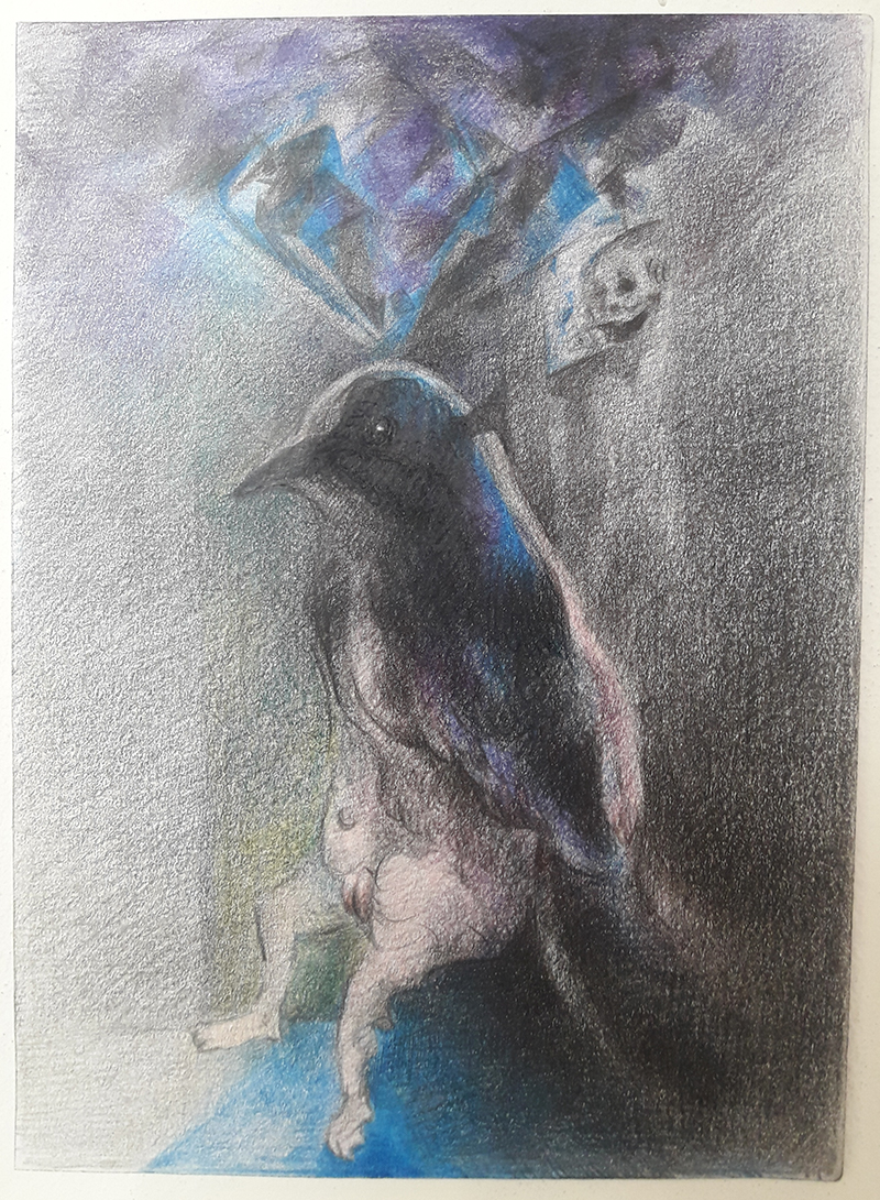 Arrastro mis alas mientras camino, veo el zafiro y escucho a quien susurra en la oscuridad, lápices policromos, 2020.